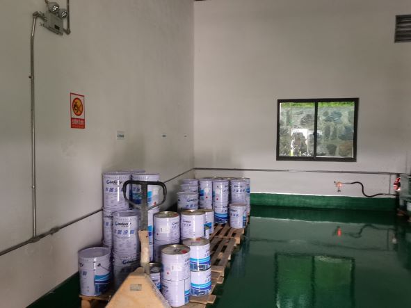 企業(yè)生產(chǎn)過(guò)程中使用的危險(xiǎn)化學(xué)品為PU漆和UV漆。PU漆包括PU漆底漆、PU漆面漆、PU稀釋劑、PU漆固化劑,火災(zāi)危險(xiǎn)性均為甲類;UV漆包括UV底漆、UV面漆,火災(zāi)危險(xiǎn)性均為丙類。PU漆在噴漆工藝中使用,使用地點(diǎn)為3#廠房2層噴漆間內(nèi),共設(shè)有2個(gè)噴漆間。UV漆在輥涂工藝中使用,使用地點(diǎn)為3#廠房2層輥涂車間內(nèi),共設(shè)有2條輥涂生產(chǎn)線,另外,3#廠房2層設(shè)有1個(gè)調(diào)漆間。企業(yè)危險(xiǎn)化學(xué)品儲(chǔ)存場(chǎng)所為廠區(qū)東南角的危險(xiǎn)化學(xué)品倉(cāng)庫(kù),危險(xiǎn)化學(xué)品倉(cāng)庫(kù)分為2個(gè)隔間,分別儲(chǔ)存危險(xiǎn)化學(xué)品和危險(xiǎn)廢物,廠區(qū)內(nèi)未設(shè)置危險(xiǎn)化學(xué)品中間倉(cāng)庫(kù)。